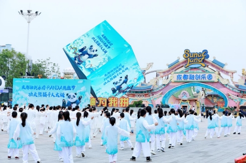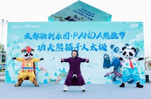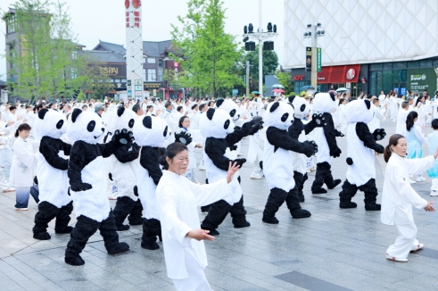 5月1日,成都融创文旅城魔方广场,四川省道教协会理事、青城派第三十六代掌门人刘绥滨和来自都江堰市太极拳协会、都江堰市老年体育协会南桥太极分会、都江堰市青城小学的1000余名太极拳爱好者与大熊猫人偶随着音乐缓缓起势,展现了一场精彩的太极拳表演。