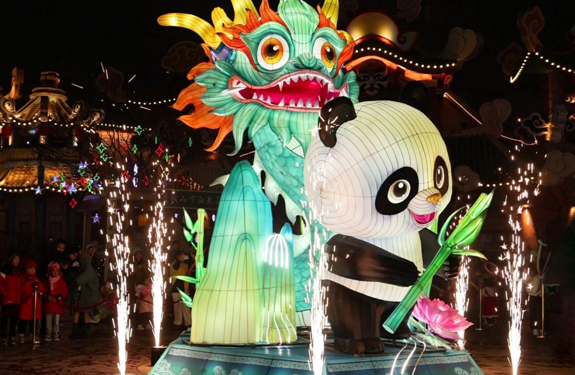 12月22日晚,随着成都融创乐园大湖秀广场中心的天府熊猫花灯隆重点亮,成都第二届天府熊猫光影节正式开幕。备受关注的“中华巨龙”主灯同步亮灯,园区数万盏彩灯和创意灯组相继点亮,目之所及皆是火树银花,流光溢彩,为广大市民游客呈现出一场极致梦幻的冬日光影盛宴。都江堰市人民政府副市长曾滢茜、成都融创主题娱乐总经理刘影为开幕式致辞,中共都江堰市委书记蒋蔚炜宣布第二届天府熊猫光影节开幕。