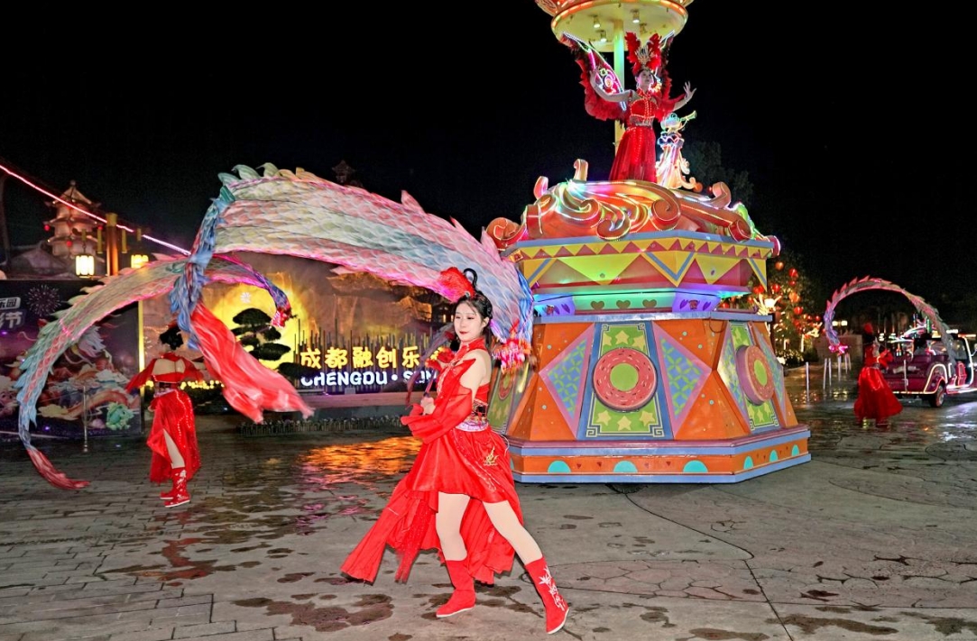 此次光影节内容丰富多彩,除了可观赏众多绝美灯组外,园区各类演出活动同样精彩纷呈。盛大花火巡游《天府之光奇妙游》惊艳来袭,民族歌舞盛宴《篝火晚会》、异域风情幻火秀《神秘部落》、震撼大湖秀《幻梦太阳神鸟》等缤纷演艺燃情荟萃;冰上音乐剧《爱丽丝梦游仙境》、高燃马战《精忠报国·岳飞传奇》两大王牌剧场演艺带来梦幻童话和热血沸腾的双重体验;更有童梦巡游、国潮演艺、亲子互动等狂欢演出轮番登场,欢乐氛围十分到位。与此同时,成都融创乐园20余项炫彩游乐日夜开放,飞跃四川、家庭过山车、时光木马、家庭娱乐中心等设备一票畅玩,是年轻游客、亲子家庭出游玩乐的好去处。